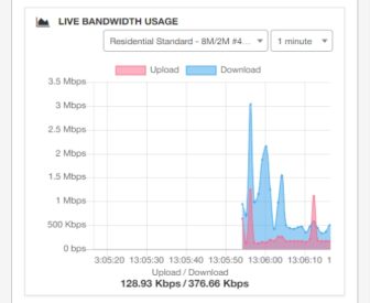 • On the dashboard you have a quick view over your Account Balance, Support Tickets, Unpaid Invoices and a live graph displaying current Live Bandwidth Usage (Img. 2) for your selected package.