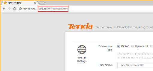 • Next, you need to open a browser on your computer, phone or tablet. In the address bar, type in the IP address 192.168.0.1 and press on the enter button. After entering the above IP address you will be greeted by the routers Quickset screen (Img. 2).